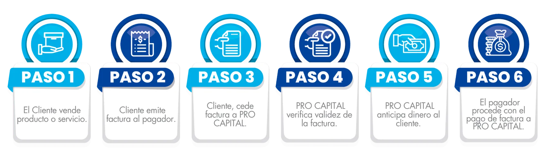El cliente (emisor) recibe el anticipo de sus facturas y, al llegar la fecha de vencimiento, realiza el pago directamente a PRO CAPITAL, sin que el comprador (pagador) sea notificado de la operación.